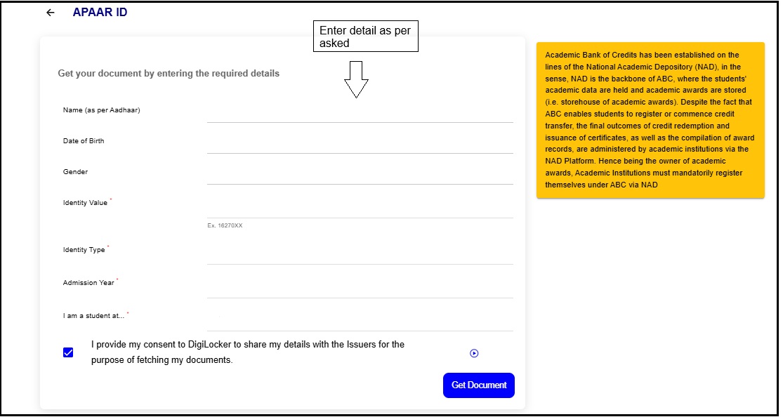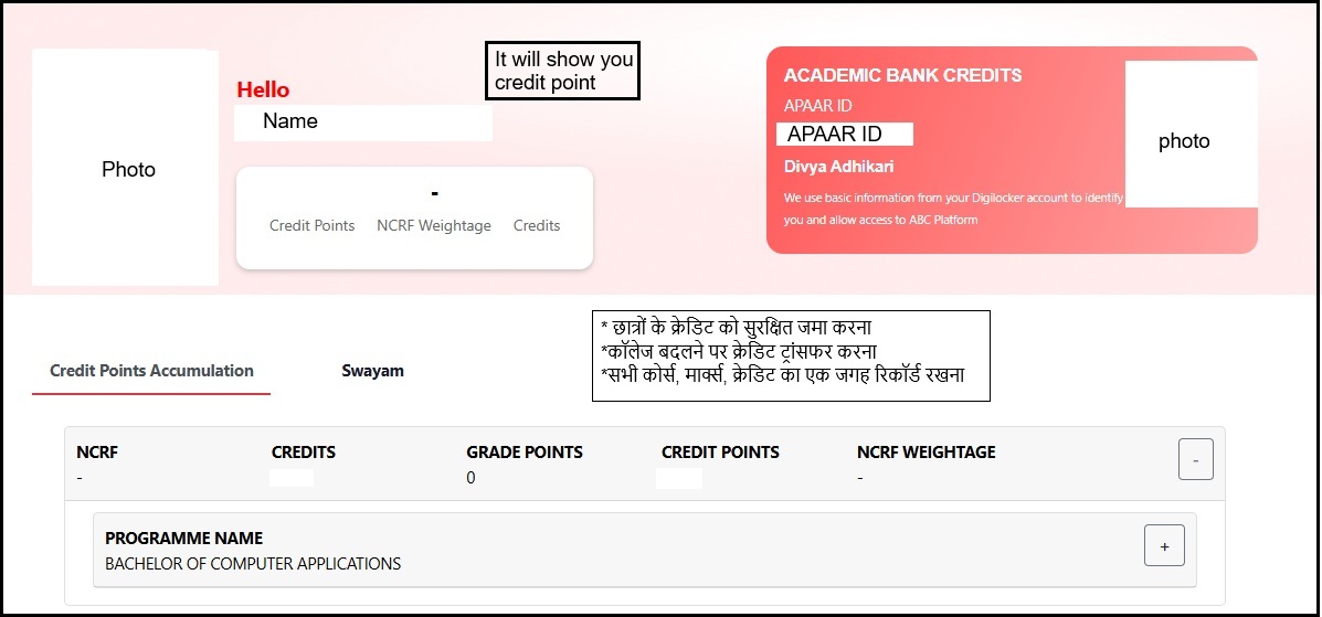 एक विशेष पहचान संख्या है जो किसी छात्र को Academic Bank of Credits (ABC) में रजिस्ट्रेशन के समय दी जाती है। यह संख्या आपके ABC खाते का खाता नंबर होती है, जिसमें आपके कॉलेज या विश्वविद्यालय में अर्जित सभी अकादमिक क्रेडिट्स जमा होते हैं। ABC ID के माध्यम से छात्र अपने क्रेडिट्स को देख सकते हैं, किसी अन्य कॉलेज में ट्रांसफर कर सकते हैं, या डिग्री और कोर्स पूरा करने के लिए उनका उपयोग कर सकते हैं।