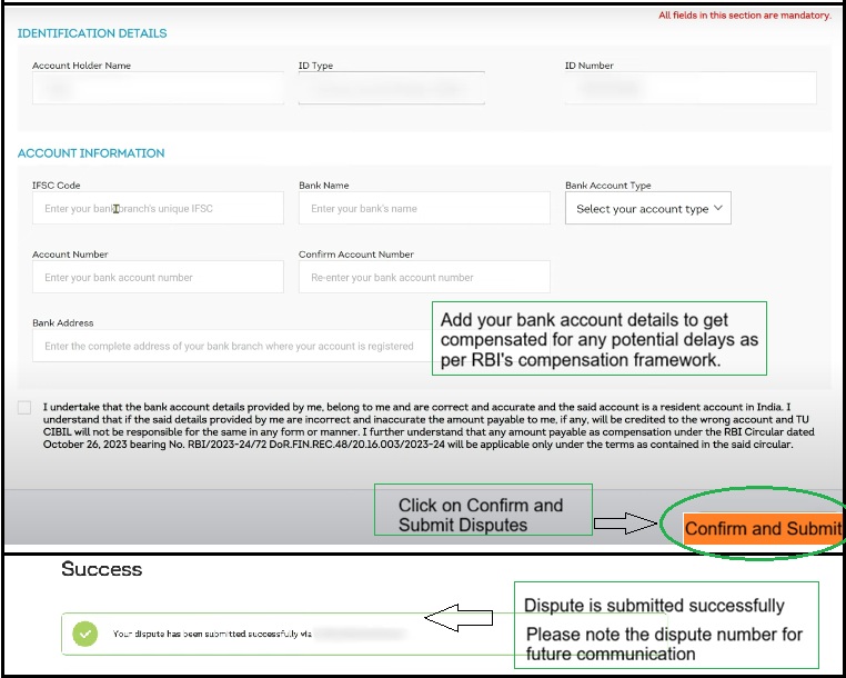 Add your bank account details to get compensated for any potential delays as per RBI's compensation framework.